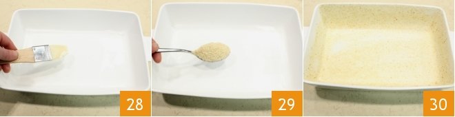 Take a 12x8-inch baking dish and brush it with butter 28, then sprinkle with breadcrumbs on both the bottom and the sides (29-30).