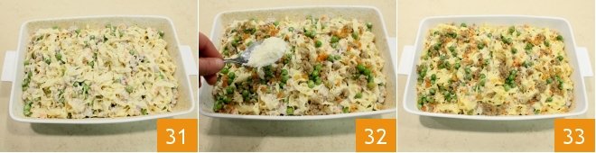 Pour the dressed tagliatelle inside and distribute them evenly 31; sprinkle with Parmesan cheese 32 and gratinate in the oven under the grill at 392°F for 5-10 minutes. Then remove the baked tagliatelle casserole from the oven 33 and serve it hot!