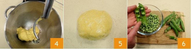 Continue kneading until the dough becomes smooth and homogeneous and detaches from the sides 4. Form a dough ball and wrap it with plastic wrap 5 to place it in the refrigerator for at least 1 hour. Meanwhile, focus on the filling: shell the peas 6