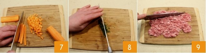 then finely chop the carrots 7, onion, celery, thyme 8 and sausage removed from its casing 9.
