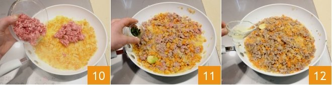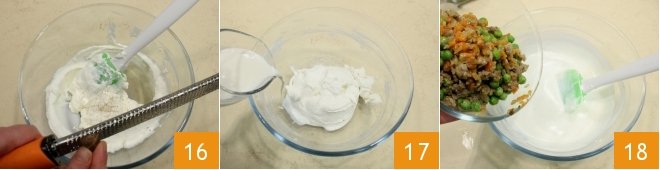 flavor it with nutmeg 16, season with salt and pepper to taste, then add the milk 17 and mix the ingredients before adding the white ragù 18.