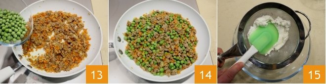 When the wine has evaporated and the sausage is well browned, add the peas 13 and let cook for about ten more minutes, then season with salt and pepper and turn off the heat 14. In a small bowl, sieve the ricotta 12