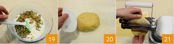 Mix the ingredients 19 and set the filling aside. Retrieve the fresh pasta 20 and divide it into two pieces to roll it out more easily. Attach the pasta roller to the stand mixer, which with its planetary motion will allow you to roll out the dough 21.