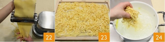 Repeat the operation several times until it becomes a few millimeters thin, then set it to obtain the tagliatelle 22 which you can spread on a sieve or a lightly floured tray, and dust with a little flour to let them dry 23. After letting them rest for 15-20 minutes, you can cook them in boiling water in which you have poured a little oil (this will prevent the tagliatelle from sticking together during cooking) 24.