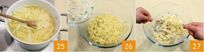 Cook the tagliatelle for 1-2 minutes 25 and drain them al dente; place them in a bowl and pour over the ragù sauce and ricotta cream 26, then mix thoroughly 27.