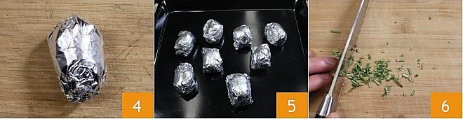 wrap the potatoes in a foil with aluminum wrap 4. Bake the foil-wrapped potatoes in a preheated static oven at 392°F 5 for about 50 minutes (or in a ventilated oven at 356°F for 40 minutes). Chop the remaining rosemary 6 and set it aside.