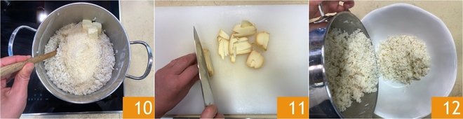 Drain the rice al dente and stir in the remaining 13 tbsp of butter 7, the milk 8, and 1/3 cup of grated Parmigiano Reggiano 9.