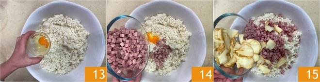 Add the egg 13, diced ham 14, and almost all the scamorza cheese 15, leaving some cubes aside for the top.