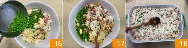 Also add the peas 16 and mix everything together 17. Transfer the mixture to a 13x9 inch baking dish and smooth the surface 18.