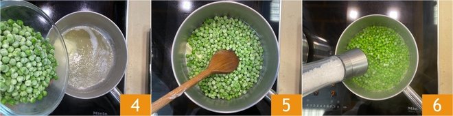 Add the peas 4, stir, and cook for about 5 minutes 5. Finally, season with salt 6 and set aside.