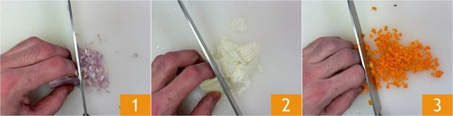 To prepare the baked white ziti, start with the ragù: clean and finely chop the shallot 1 and the onion 2, then dice the carrot into small cubes 3.