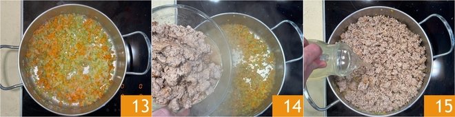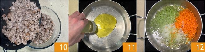 Combine the two browned meats 10 and set them aside. In a pot, heat a swirl of extra virgin olive oil 11, add the shallot, onion, celery, and carrot 12 and let them soften over medium-high heat with a pinch of salt.