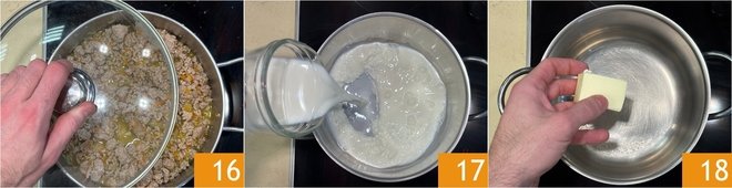 Cover with a lid 16 and cook on low heat for about an hour and a half, until the ragù is tender and well combined. Meanwhile, prepare the béchamel: heat the milk in a saucepan 17, while in another pot melt the butter 18.