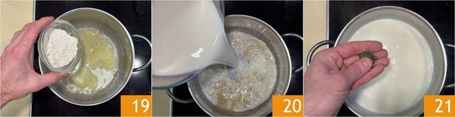 Add the flour 19 and stir. Pour in the warm milk gradually, stirring with a whisk 20, and continue cooking on low heat until it boils, stirring constantly 21. When the béchamel is thick and creamy 21, season with thyme, remove from heat, and cover with plastic wrap in contact.