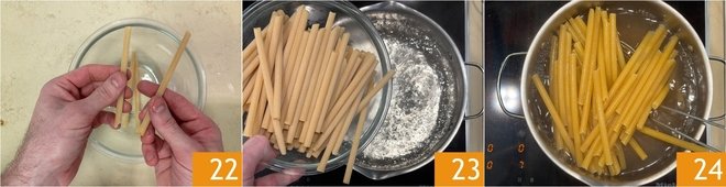 Then move on to the pasta: break the ziti in half 22 and cook them in boiling salted water for about 5 minutes 23, then drain them 24.