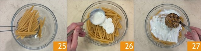 Transfer the pasta to a large bowl 25. Add a third of the béchamel 26 and a third of the ragù 27.