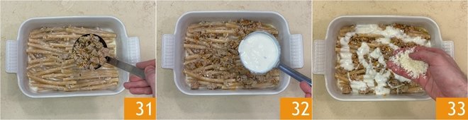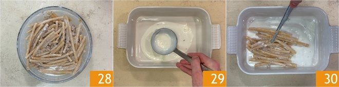 Mix well to distribute the seasoning 28. Now take a baking dish of 8x11 inches: spread a layer of béchamel on the bottom 29 and arrange the ziti horizontally, neatly aligning them 30.