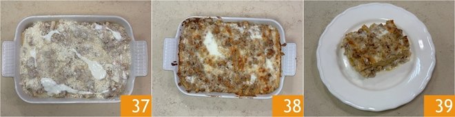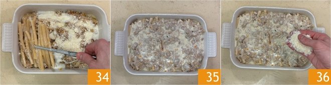 Then arrange the second and last layer of pasta, this time vertically 34, and finish with the remaining ragù and almost all of the remaining béchamel 35. Generously sprinkle the surface with grated Parmigiano Reggiano 36.