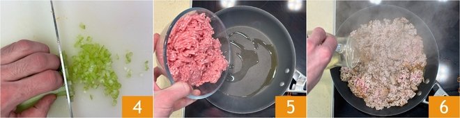 Do the same with the celery 4 and set the vegetable mixture aside. Heat a drizzle of oil in a non-stick pan and brown the veal for a couple of minutes 5, deglazing with half of the white wine 6.