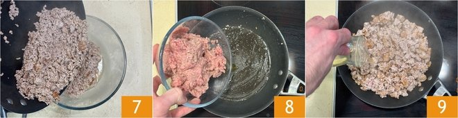 Transfer it to a bowl 7 and repeat with the pork 8, deglazing with the remaining wine 9.