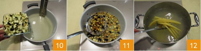 and once they are golden brown 10, drain them using a slotted spoon and place them on a tray lined with paper towels 11 to drain the frying oil 11. Then cook the pasta 12 in a pot of boiling salted water.