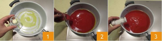 To prepare baked ziti, first prepare the tomato sauce: sauté a peeled and halved garlic clove in a pan with olive oil 1, then pour in the tomato sauce 2, add salt 3, pepper and let it cook for about 30-35 minutes over medium heat.