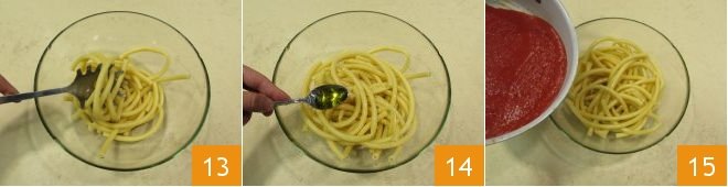 Once cooked, drain it and place it in a large bowl, add a little olive oil to prevent sticking 14, add the tomato sauce 15