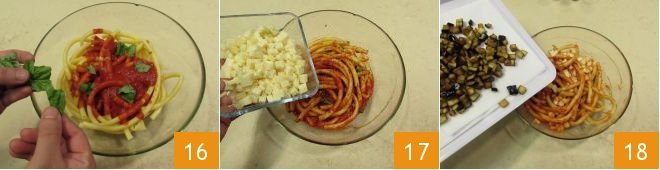 add the fresh torn basil 16, the diced Provola 17, and the eggplants 18.