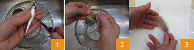 To prepare the baking dish of anchovies and potatoes, clean the anchovies: remove the head, cut the belly 1, open them like a book, and remove the entrails 2, rinse them well under running water, and then place them on a tray lined with paper towels to dry them 3.