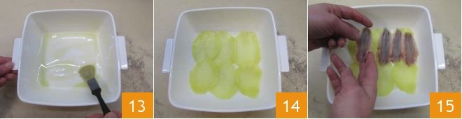 Set aside the herbs, take an 8 x 8-inch baking dish, oil the bottom 13, lay down a first layer of slightly overlapping potatoes 14, then spread a layer of anchovies 15
