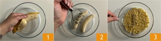 To prepare the banana and chocolate cake, you will need to use two mashed bananas inside and one as decoration. Peel two of the bananas 1 and mash them with a potato masher or a fork 2 until you obtain a batter 3.