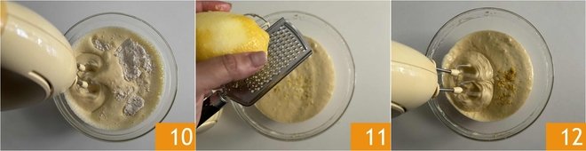 After stirring 10, add the zest of one lemon 11 and mix again 12.
