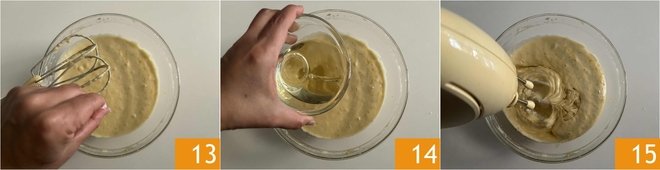 Next, add a pinch of salt 13 and the vegetable oil 14, continuing to mix with the electric whisk 15.