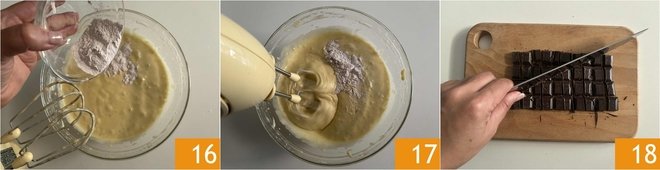 Add the previously sifted baking powder 16 and mix it into the batter 17. Then start cutting the dark chocolate into pieces, or if you prefer, use chocolate chips 18.