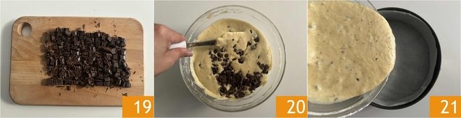 When you have your chocolate pieces, add them to the batter, setting aside a couple of handfuls 19. Mix one last time 20 and pour the batter into a 9.5-inch diameter pan lined with parchment paper or buttered and floured 21.