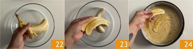 Peel the banana set aside 22 and cut it into three parts lengthwise 23, then arrange it on the surface of the cake 24.