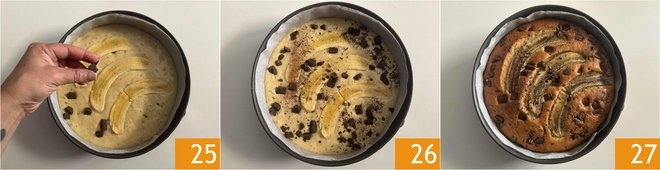 Finally, add some chocolate pieces 25 and bake the cake in a preheated static oven at 350°F for about 35 minutes 26. Always do the toothpick test before removing the cake from the oven, as cooking times may vary slightly depending on the oven. The banana and chocolate cake is ready, just let it cool 27 before removing it from the mold and serving.