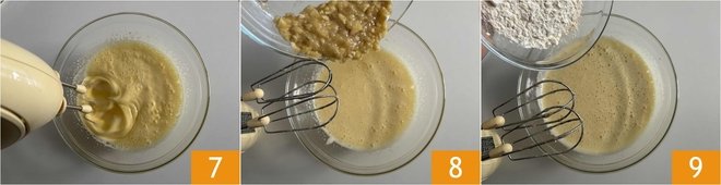 After achieving the right consistency 7, add the previously mashed banana pulp and mix it into the batter 8. Then add the previously sifted flour 9.