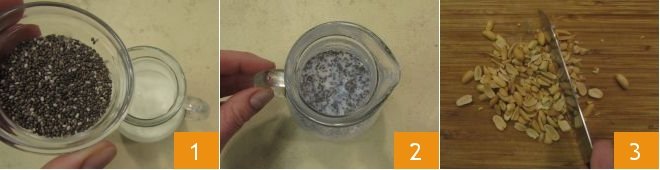 To make the banana and peanut bundt cake, first soak the chia seeds in the buttermilk for 4-5 minutes (1-2). Meanwhile, chop the peanuts with a knife and set them aside 3.