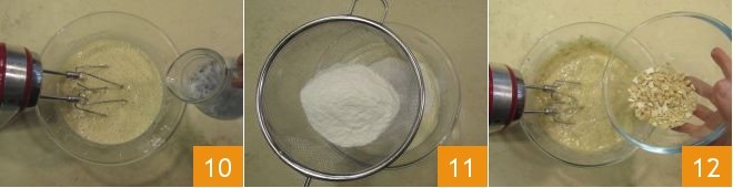 Continue to mix with the beaters and pour in the buttermilk with the chia seeds 10. Then add the dry ingredients (flour and baking powder) by sifting them through a sieve 11. Finally, add the chopped peanuts 12