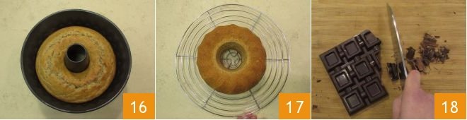 Bake in a preheated static oven at 350°F on the middle rack for 40 minutes. At the end of baking, remove the bundt cake from the oven 16 and let it cool for a few minutes. Then remove the cake from the mold by flipping it onto a wire rack 17 and let it cool for an hour at room temperature. Meanwhile, finely chop the chocolate with a knife 18 and transfer it to a bowl.