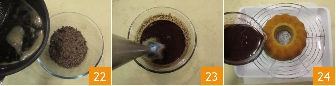 Pour the syrup over the chocolate 22 and emulsify the sauce with an immersion blender, being careful not to create air bubbles 23, then pour the obtained glaze over the bundt cake 24.