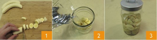 To prepare the banana liqueur, first peel the bananas and slice them: you will need 350 g (12.3 oz) of fruit pulp 1. Transfer them to a glass jar and add the alcohol 2, then close with an airtight lid and let it rest for a week at room temperature, shaking the mixture occasionally 3.