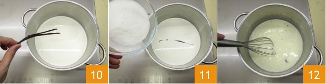 then add the vanilla pod with its seeds 10 and the sugar 11. Heat the mixture without bringing it to a boil, stirring to completely dissolve the sugar 12.