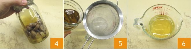 After the maceration time 4, filter the liquid into a bowl 5: you should obtain about 400 g (14.1 oz) of banana-flavored alcohol 6.