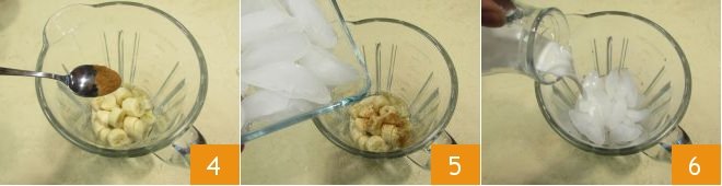 Add the cinnamon 4, ice cubes 5, and cold milk 6.