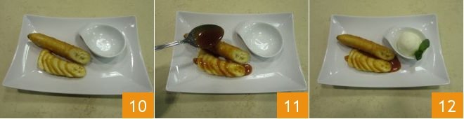 Now that the bananas are cooked, cut half a banana into slices 10 and arrange it on a dessert plate. Place the other banana alongside the sliced one and pour the caramel sauce over both 11. You can serve leaving the flambéed banana whole or cutting it, entirely or partially, into slices to place alongside each other for an elegant presentation of the fruit. You can also serve these delicious bananas flambé with a scoop of vanilla or chocolate ice cream.