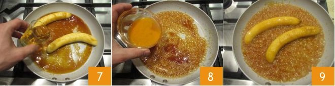 At this point, add the rum 7 and let it catch fire, slightly tilting the pan towards the flame or using a culinary torch. When the flames have died down completely, remove the bananas from the pan and set them aside. In the remaining caramel in the pan, add the orange juice 8 and emulsify with a wooden spoon. Then put the bananas back in the pan and cook them again, turning them for even cooking 9.