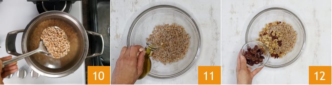 Meanwhile, the barley should be cooked; drain it well 10 and transfer it to a large bowl. Now everything is ready to assemble the salad: season with oil 11 and add the sun-dried tomatoes, walnuts, and olives here 12.
