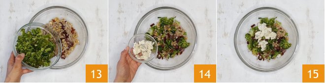 Continue by incorporating also the broccoli 13 and the diced gorgonzola 14. Mix and serve the barley and broccoli salad 15.